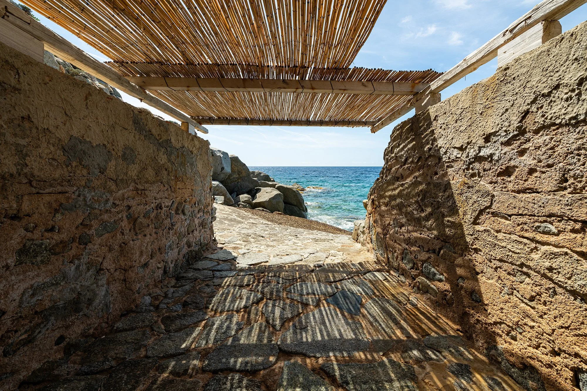 Maison de charme anni 60, ispirata all’opera organicista di Frank Lloyd Wright, fu costruita con pietre del luogo e cemento armato. La casa sorge su uno strapiombo di circa 50 metri e attraverso un’agevole e affascinante discesa si collega alla scogliera sottostante, unendo idealmente il cielo ed il mare. L'intento che mosse queste scelte costruttive era quello di portare il fruitore a sentirsi parte integrante della natura circostante, mentre nella concezione degli spazi interni, ricercati ma essenziali, ci si è invece ispirati al modulo abitativo della barca.